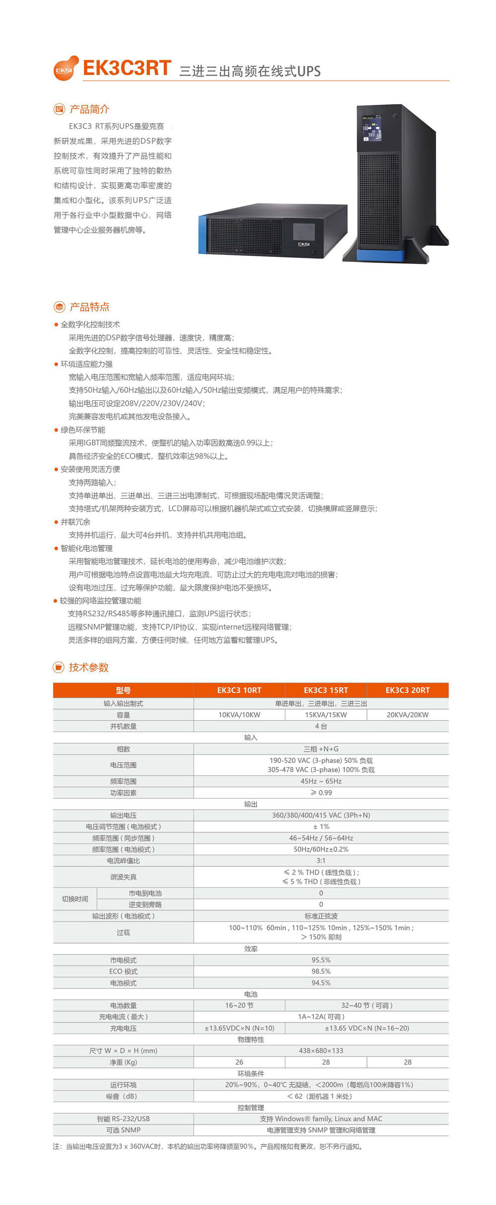 功率:10–20 kVA 電壓:380 / 400 / 415 V 安裝方式:塔式