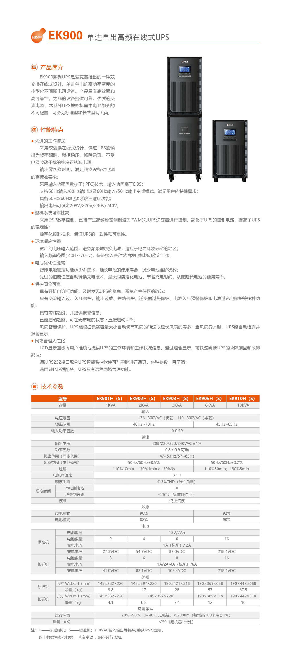 EK900RT系列采用雙轉換純在線式架構設計,單進單出的塔式不間斷電源設備。能有效解決電源問題,對電網(wǎng)出現(xiàn)的斷電、電壓過高或過低,浪涌電壓、諧波失真、雜波干擾等狀況都可以提供良好的解決 。